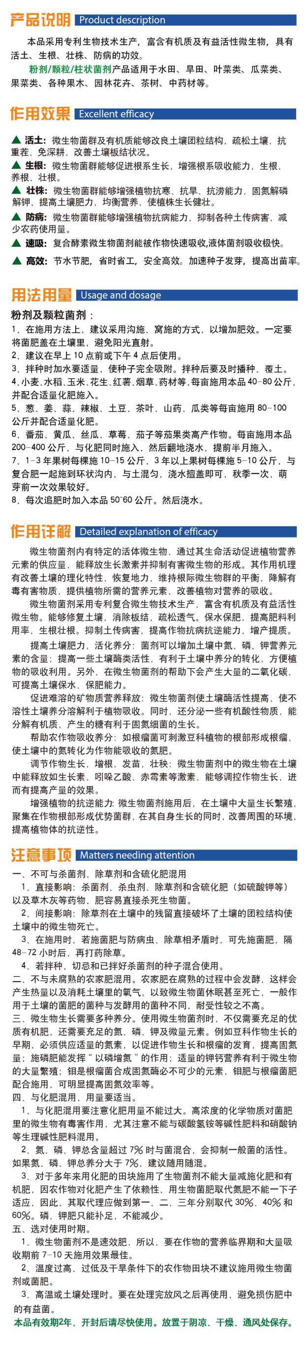 【适用作物】粉剂/颗粒菌剂产品适用于水田、旱田、叶菜类、瓜菜类、果菜类、各种果木、园林花卉、茶树、中药材等。